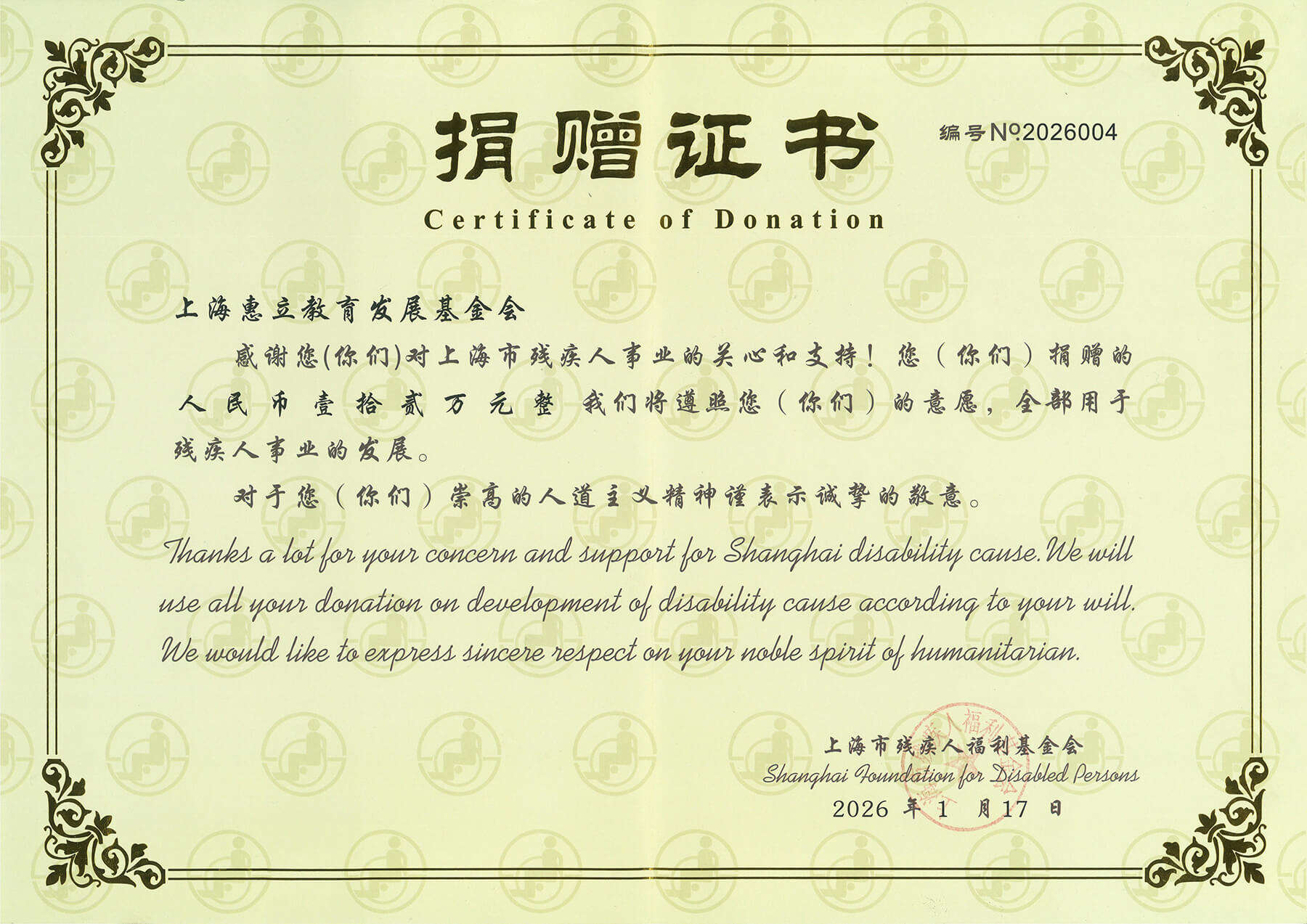 上海市残疾人福利基金会捐赠证书